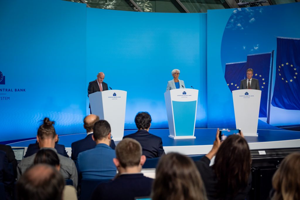 Rueda de prensa del BCE, de izda. a dcha. Luis de Guindos, Vicepresidente del BCE, Christine Lagarde, Presidenta del BCE y Wolfang Proissl, Director General de Comunicación del BCE. Fotografía tomada por Angela Morant bajo licencia Creative Commons.